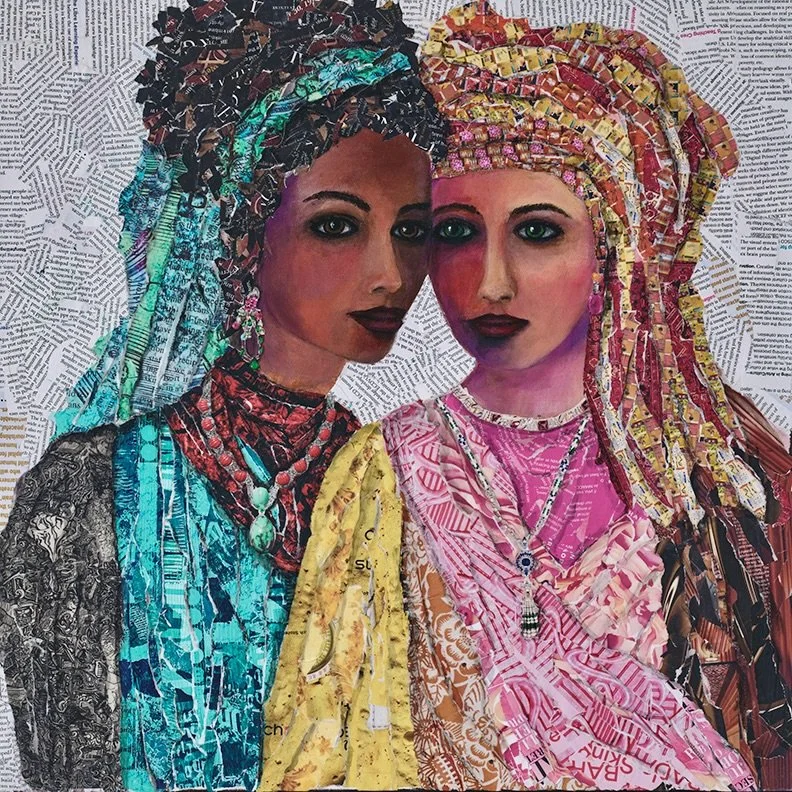 “24x24” Mixed Media art on canvas using acrylic paint for the faces and the rest is paper collage. On display at my gallery at Liberty Station barracks 19 suite 213