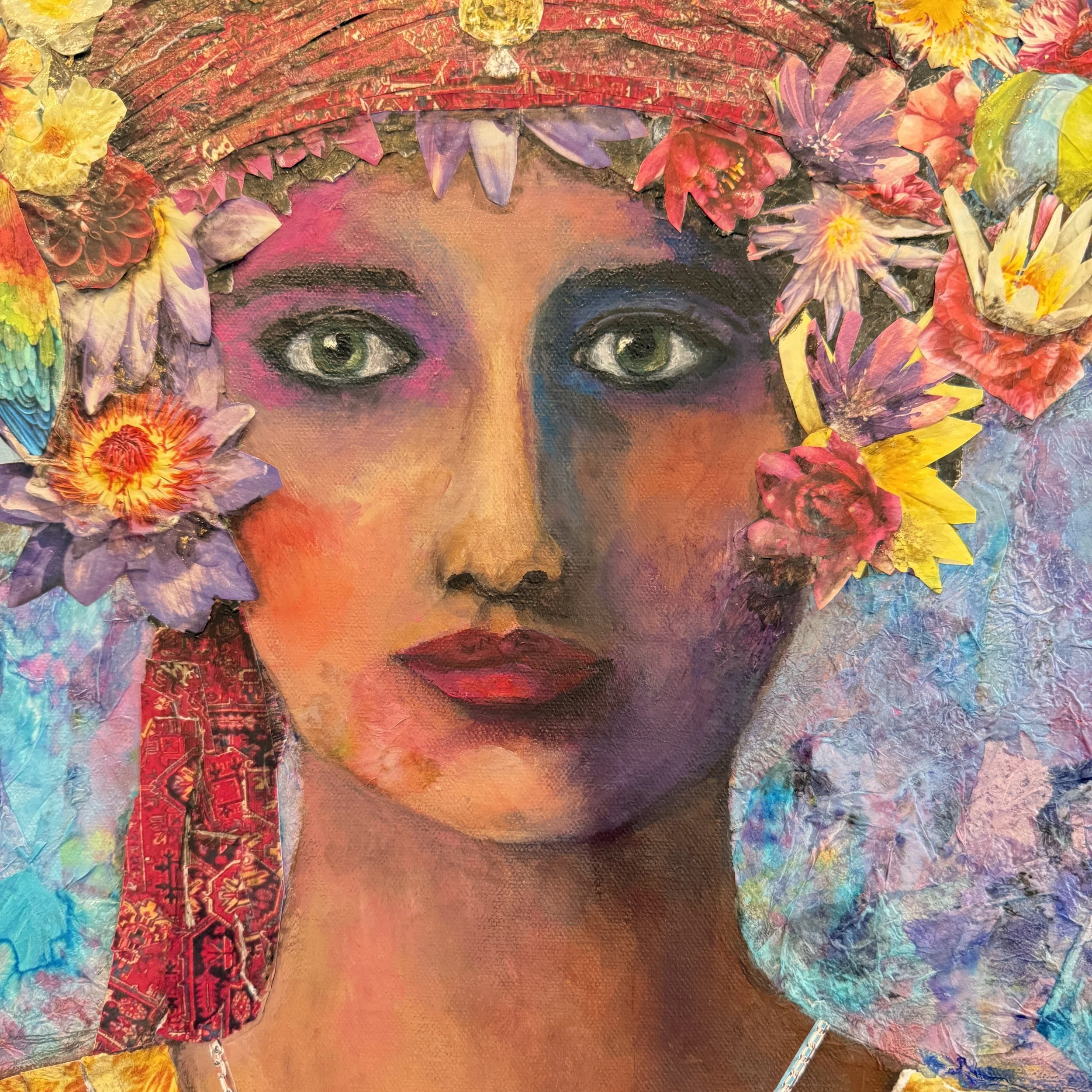 “20x20” Mixed Media Art using Acrylic paint for the face and the rest is Paper and glue on canvas